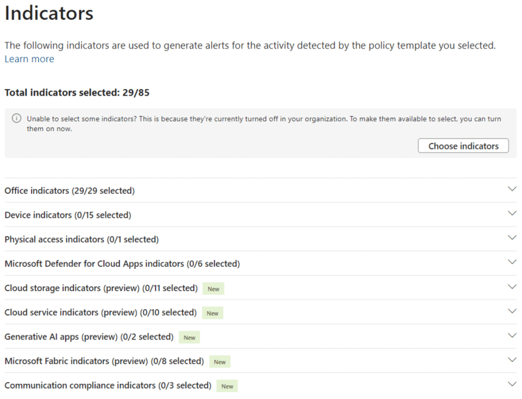 8. On the “Indicators” page, ensure that the Office indicators are selected. This will ensure that alerts are generated based on exfiltration activities in Microsoft 365, such as downloading a file from SharePoint and emailing it as an attachment to an external user.