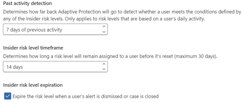 5. Insider risk level time frame can be configured to define how long a user risk level is assigned before it’s reset.