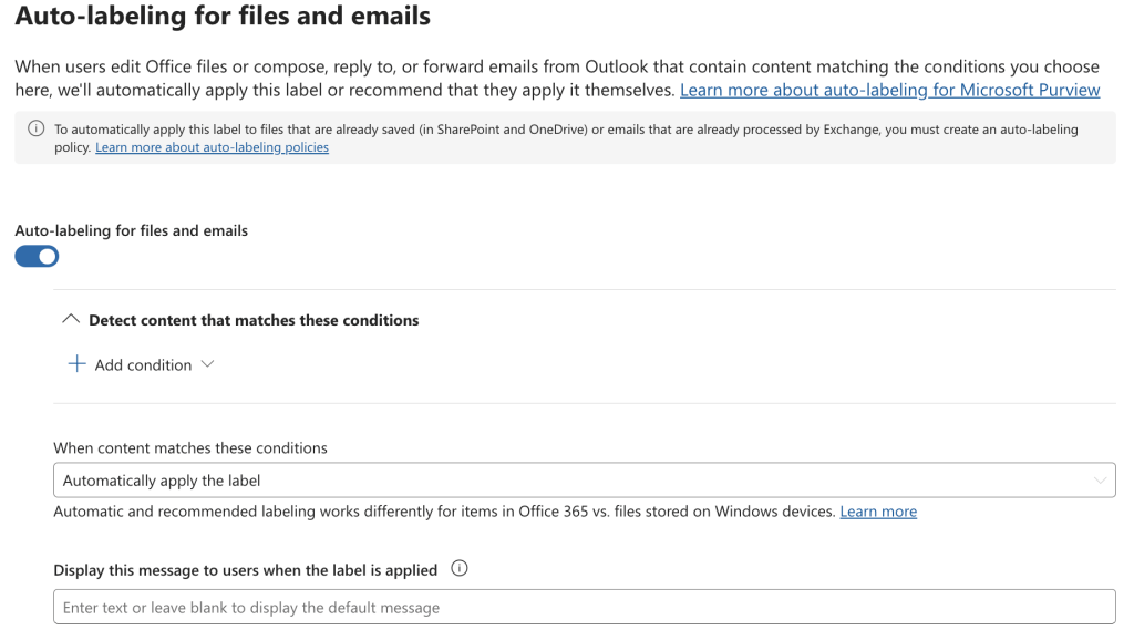 To configure client-side auto-labeling for a specific sensitivity label, navigate to Sensitivity labels in the Purview portal (https://purview.microsoft.com/informationprotection/informationprotectionlabels/sensitivitylabels) and create / edit a sensitivity label. On the Auto-labeling for files and emails configuration screen, specify the conditions for auto-labeling (e.g., content contains a credit card number), the action to take when these conditions are met (either recommend that the user apply the label or automatically apply the label), and customize the message that is displayed to users when the label is applied (optional).