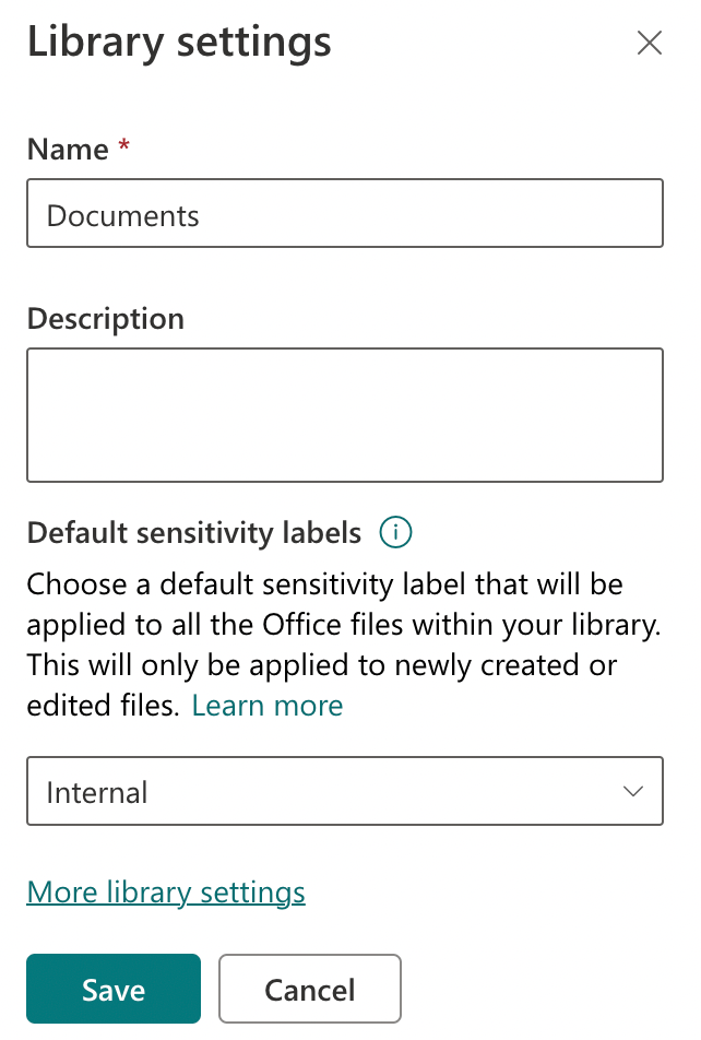 Furthermore, default sensitivity labels can be specified at the document library-level in SharePoint Online. To specify a default sensitivity label for a particular document library, navigate to Settings > Library settings and select the desired sensitivity label from the drop down under Default sensitivity labels.
