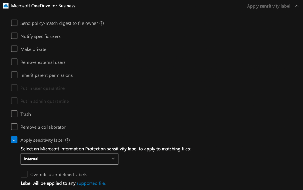 In both cases, if you would like for existing sensitivity labels to be overwritten (regardless of their priority), set “Relabel files” to On.
