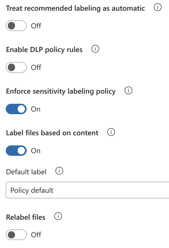 - Treat recommended labeling as automatic: Off (this can be turned On if you would like recommended sensitivity labels to be applied automatically when the appropriate conditions are met)