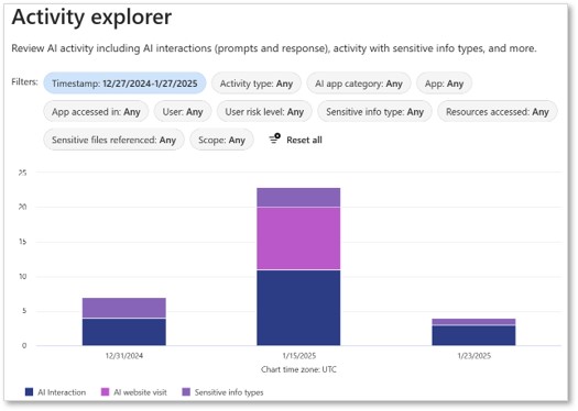 Administrators can use the DSPM for AI Activity Explorer dashboard to dig deeper into their organization’s AI usage. The following AI-related activities are currently summarized in the Activity Explorer: