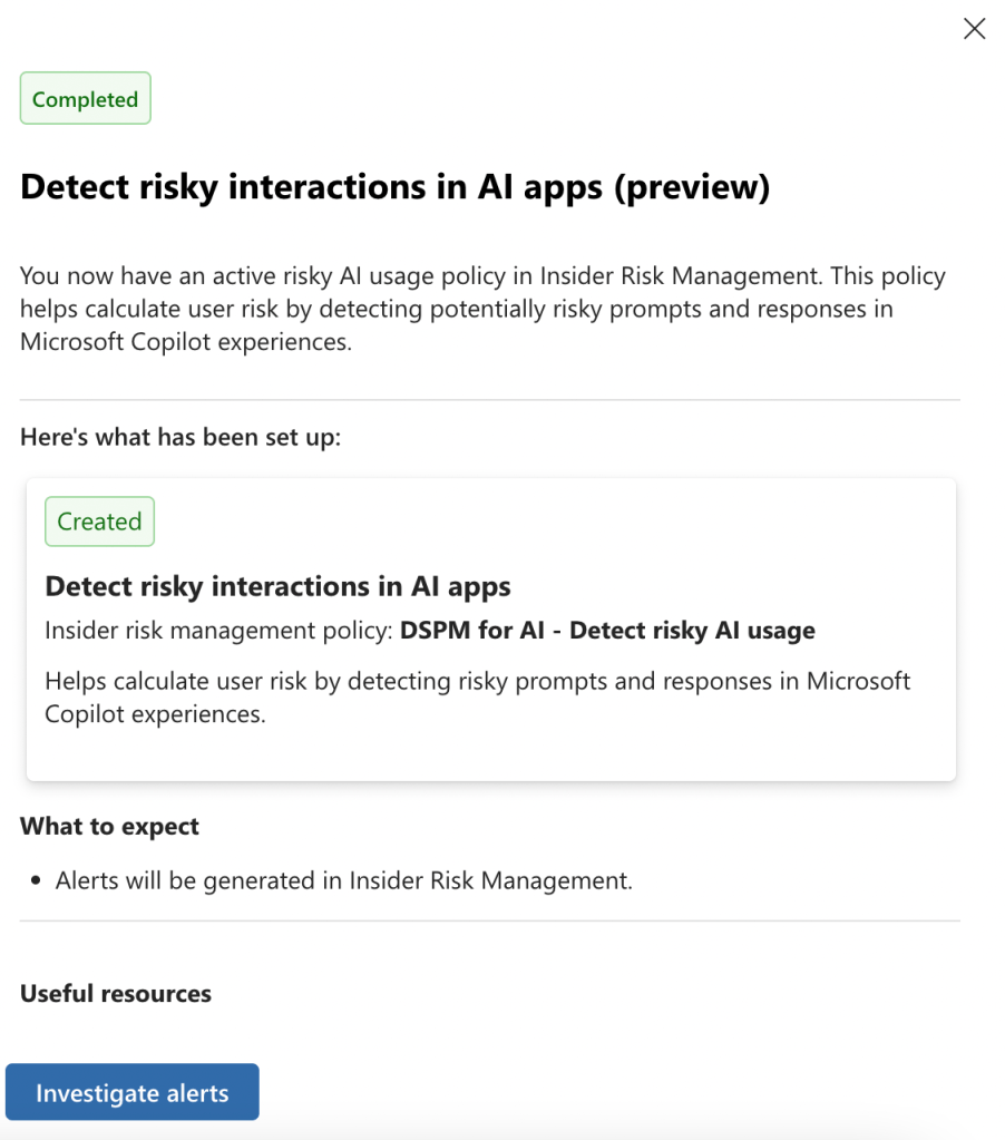 Administrators can also navigate to the Recommendations page to receive policy recommendations tailored to the current state of their tenant. One such recommendation for the creation of a monitoring policy is the “Detect risky interactions in AI apps” (insider risk management).