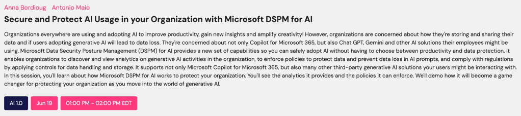 On June 19, 2025, I presented to a virtual audience of 50 highly engaged attendees at the Canadian Cloud Summit. In this session, we discussed Microsoft Purview’s new solution DSPM for AI and how it can be leveraged to effectively protect sensitive data, understand and prevent oversharing, as well as identify Shadow AI usage.