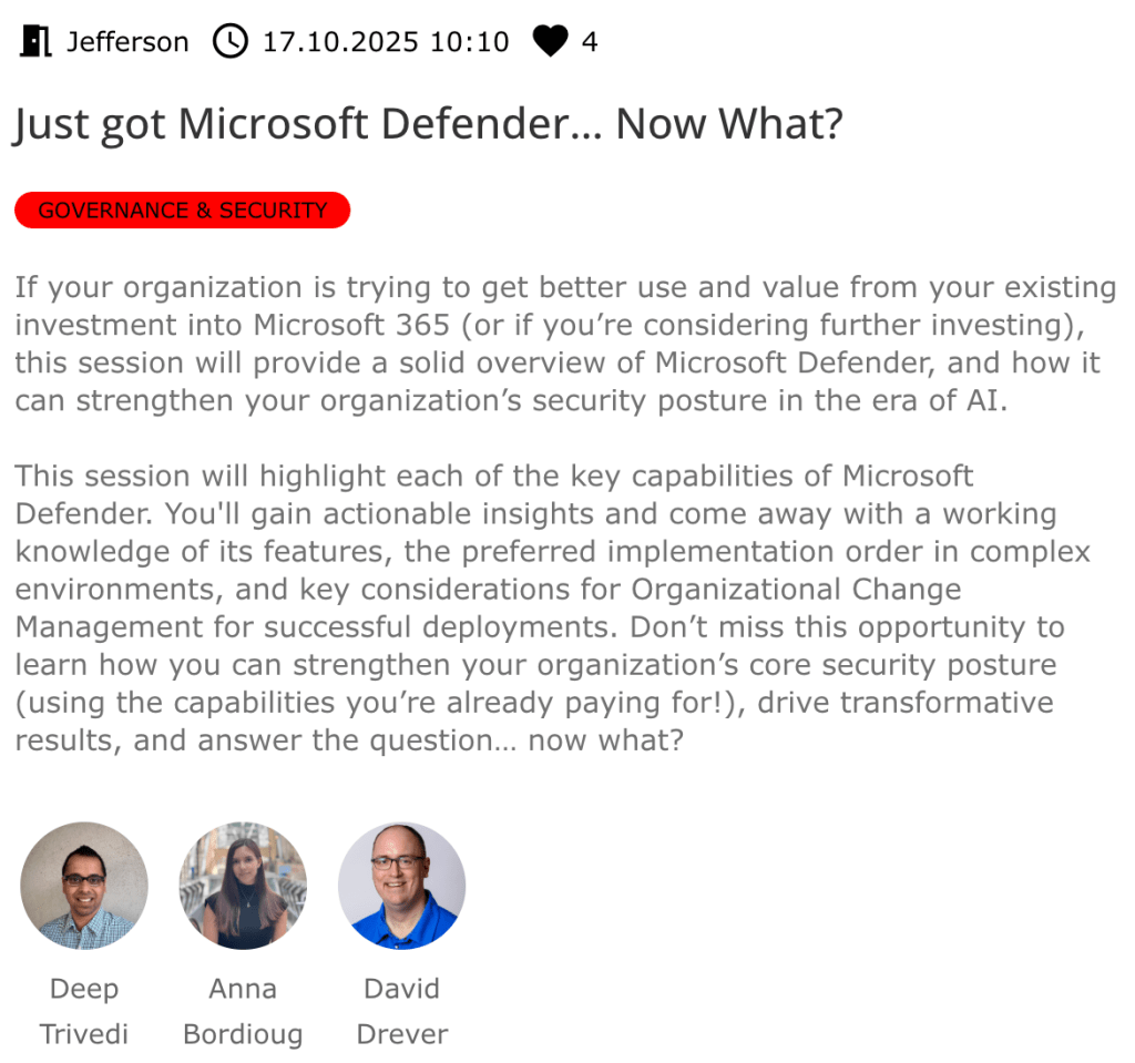 On October 17, 2025, I presented to an audience of 35 highly engaged attendees at CollabDays New England. In this session, we provided a solid overview of Microsoft Defender and reviewed how it can strengthen organizations security posture in the era of AI. We highlighted key capabilities so that attendees gained actionable insights and came away with a working knowledge of its features, preferred implementation order in complex environments, and key considerations for Organizational Change Management to support successful deployments.