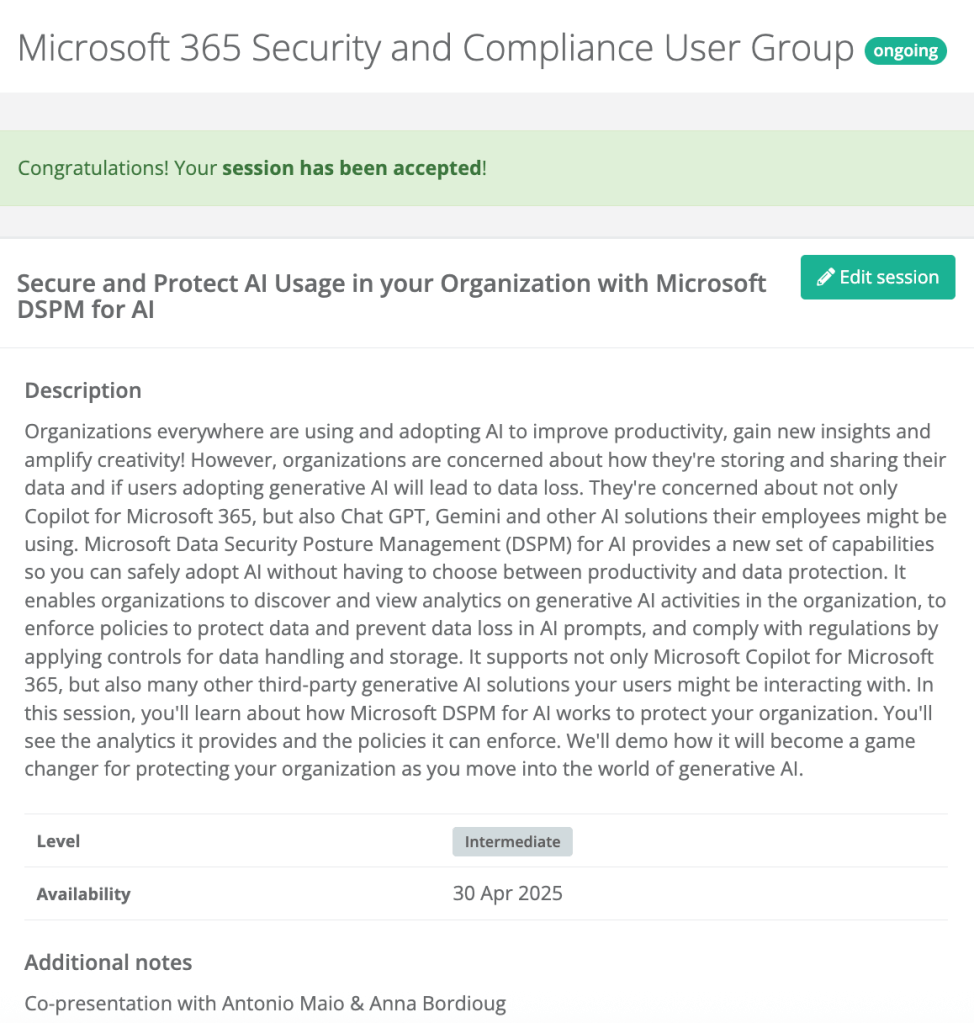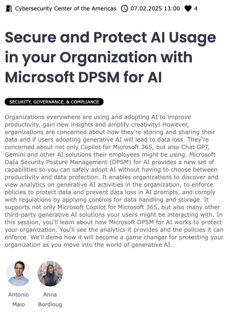 On April 30, 2025, I presented to an international audience of 72 highly engaged individuals at a virtual meetup of the Microsoft 365 Security & Compliance User Group. In this session, we discussed Microsoft Purview’s new solution DSPM for AI and how it can be leveraged to effectively protect sensitive data, understand and prevent oversharing, as well as identify Shadow AI usage.
