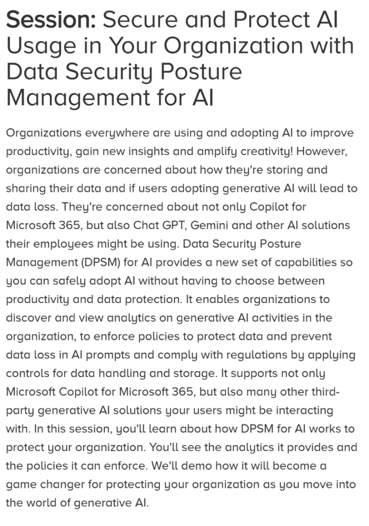 On May 7, 2025, I presented to an audience of 100 highly engaged IT professionals in-person at the M365 Community Conference in Las Vegas. In this session, we discussed Microsoft Purview’s new solution DSPM for AI and how it can be leveraged to effectively protect sensitive data, understand and prevent oversharing, as well as identify Shadow AI usage.