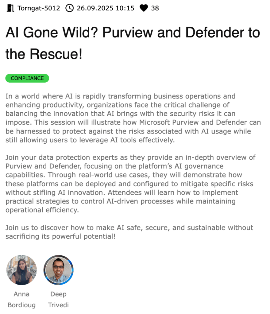The second session, “AI Gone Wild? Purview and Defender to the Rescue” took 47 highly engaged in-person attendees through an in-depth overview of Purview and Defender, focusing on the platform’s AI governance capabilities. Through real-world use cases, this session showed attendees how these platforms can be deployed and configured to mitigate specific risks without stifling AI innovation. Attendees learned how to implement practical strategies to control AI-driven processes while maintaining operational efficiency.