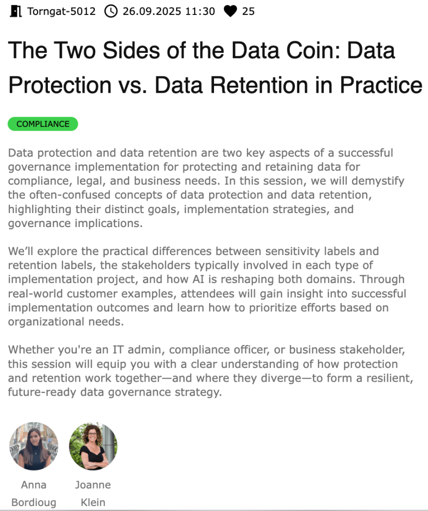 On April 30, 2025, I presented to an international audience of 55 highly engaged individuals at a virtual meetup of the Microsoft 365 Security & Compliance User Group. In this session (“The Two Sides of the Data Coin: Data Protection vs. Data Retention in Practice”), we discussed data protection and data retention – highlighting their distinct goals, implementation strategies and governance implications. Through sharing real-world practical lessons learned, attendees gained a clear understanding of how protection and retention work together (and where they diverge) to form a resilient, future-ready data governance strategy.