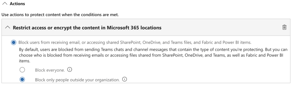 - Actions: Restrict access or encrypt the content in Microsoft 365 locations > Block only people outside your organization